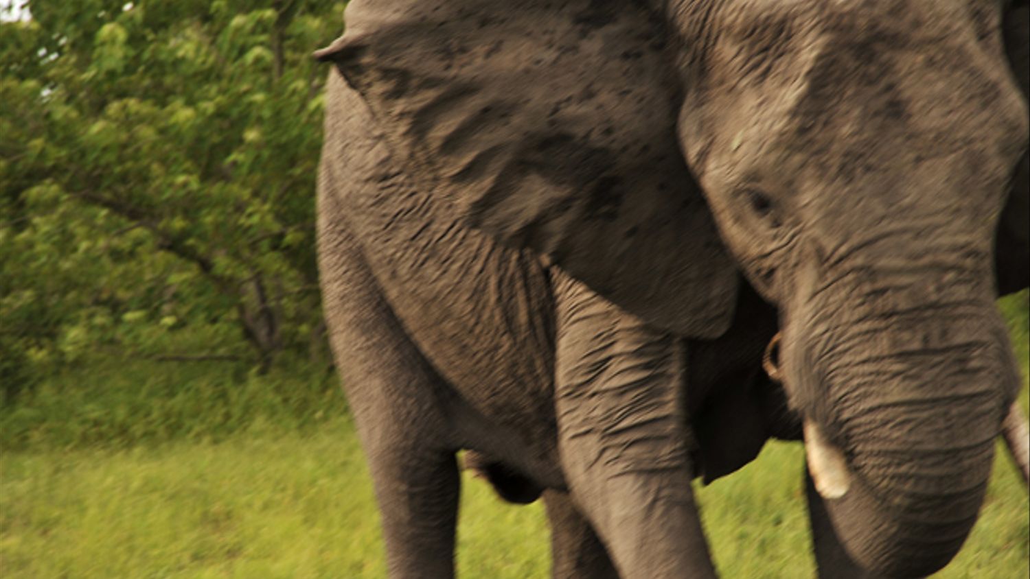 På hemvägen tar vi en paus vid Zambesiflodens strand. Fulla av upphetsning jämför vi noshörningsbilder, då plötsligt en annan mäktig syn tornar upp sig: tre elefanter på rad kommer simmande från andra sidan floden. En babyelefant kommer plötsligt upp ur ytan, hållandes sin mamma i svansen med snabeln. Vår närvaro är inte uppskattad: Mammaelefanten flaxar med öronen och det är bara för oss att skynda iväg, och den här gången sker det utan missöden.