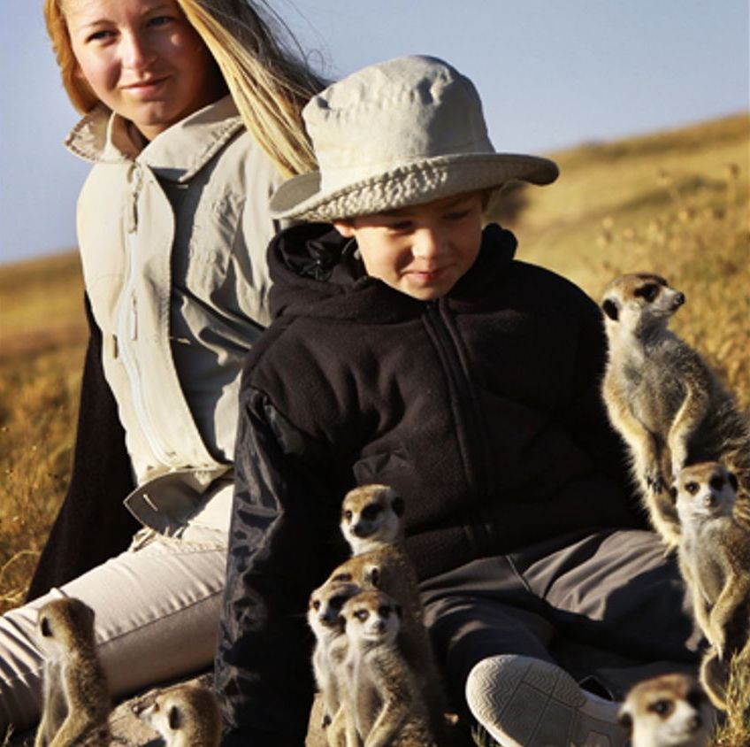 Dagen efter möts vi för en tidig morgonfika och konstaterar att natten varit lugn. Inga lejon har hörts. Istället söker vi efter en flock Surikater, 18 djur under ledning av en Alfahona. Vinden är kall i den tidiga gryningen. Otåligt spanar vi ut över den gräsbevuxna stäppen efter något som rör sig. Plötsligt syns ett litet lustigt ansikte i en håla, för att lika snabbt försvinna igen.