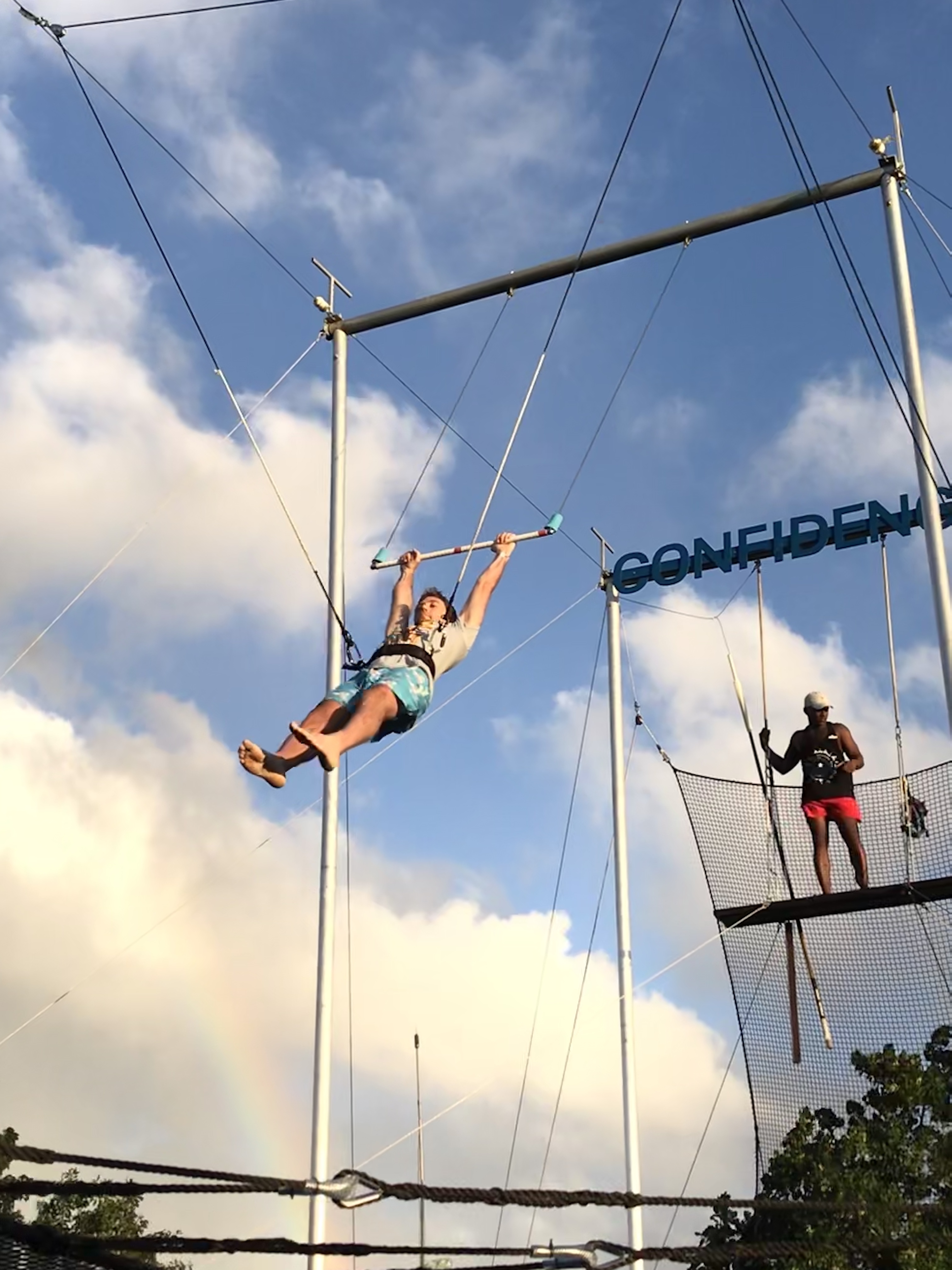 Club Med tycks gilla att utmana sina gäster utanför deras ”comfort zon”. En Club Med lek jag har hört talas om är att gästerna ute till havs byter badkläder med varandra under vattnet. Den här morgonen ska vi gunga högt över trädtopparna, högst upp på bergstoppen Montana Redonda uppe i skyn bland molnen, en oförglömlig känsla för den som vågar bejaka barnet inom sig.